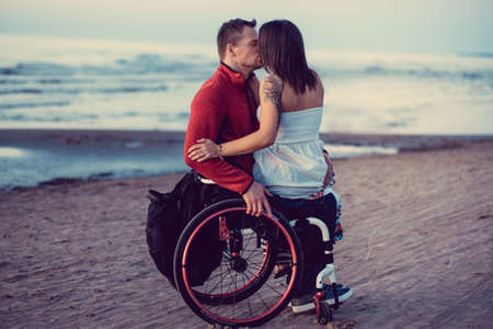 Handicapped young couple kissing on a beach.