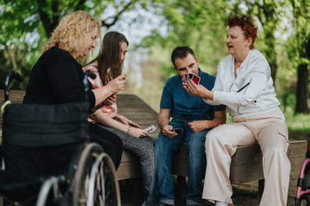 Friends Playing Cards and Socializing on Park Benches Under a Tree