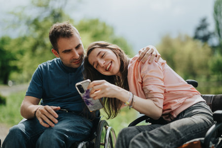 Group of wheelchair friends with helpers outdoors in a park, enjoying community and nature