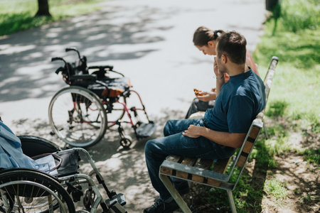 Young couple sitting on a park bench beside wheelchairs on a peaceful sunny day outdoors