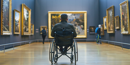 A man in a wheelchair is sitting in a museum