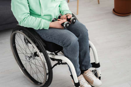 Cropped view of woman in wheelchair holding dumbbells