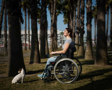 Caucasian woman in wheelchair with dog under palm trees.