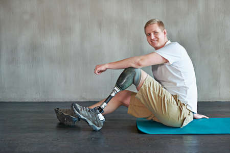 When the mind is strong, the body follows. Shot of a young amputee working out on a gym floor.