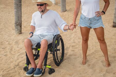 Disabled man in a wheelchair with his wife on the beach.