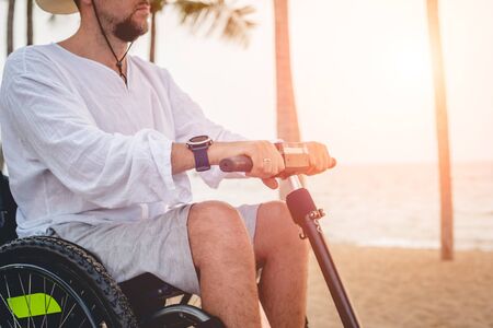 Disabled man in a wheelchair with electric scooter on the beach