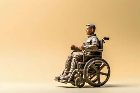 Plastic figure in camouflage uniform soldier sitting in wheelchair