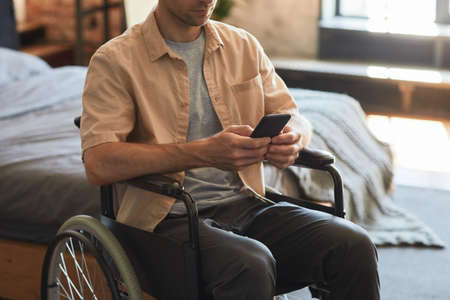 Cropped shot of modern adult man in wheelchair using smartphone at home, copy space