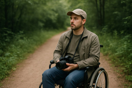 Photographer sitting in wheelchair holding camera enjoying nature photography walk in forest path