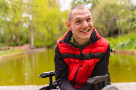 Portrait of a paralyzed young man in a public park in the city. Sitting in the wheelchair smiling looking at camera