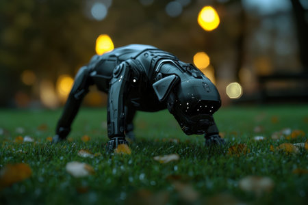 A robot dog is on the grass, looking down. The robot dog is black and has a metallic appearance