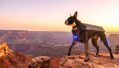 In a world where nature and technology merge, a loyal bionic Boston Terrier stands guard at the edge of a vast canyon. Bathed in the warm glow of sunset, this futuristic companion watches over the majestic landscape, embodying the spirit of adventure and the future of exploration.