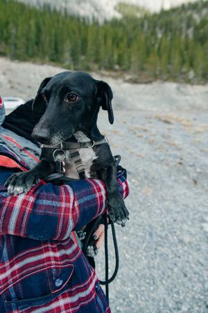 Adventurous little hiking dog on top of a mountain with scenic Canadian Nature Landscape in background. Sunny Summer Sunset. Tunnel Bluffs in Howe Sound, North of Vancouver, British Columbia, Canada.