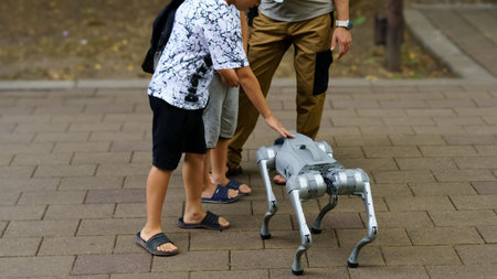 Two children engage with a robotic dog while a third observes in a park. The interaction is lively, showing curiosity and excitement in a public space.