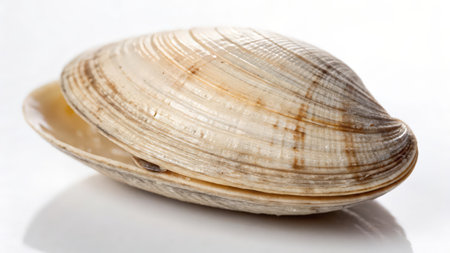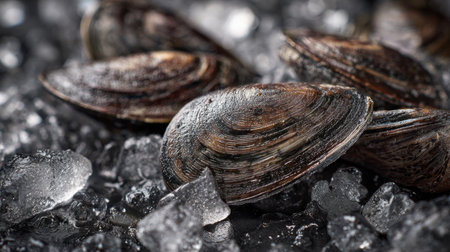 A stunning close-up of fresh clams resting on ice, showcasing their natural textures and colors, perfect for culinary dishes or seafood markets.