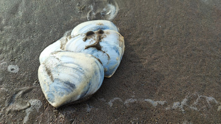 clam mussel shell is divided into two halves lies in the shape of an angel's wings on yellow sand on beach