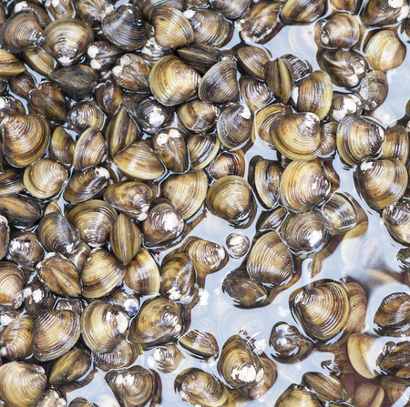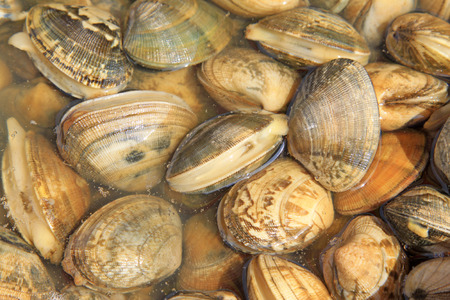 Alive hard clam in a tray for sell at local fish market in Phuket Thailand