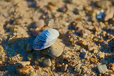 Clam lying on stone on the seashore. Sunny day. Soft focus.
