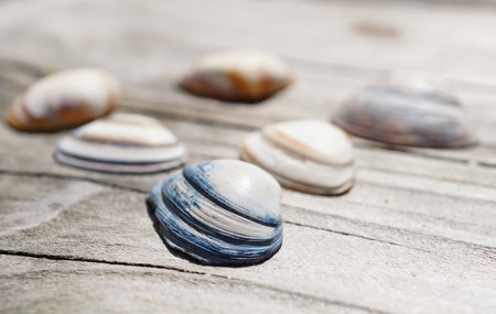 A collection of freshly gathered clams lies scattered on a weathered wooden surface, showing their natural textures and colors. Soft fabric adds a rustic touch to the coastal ambiance.