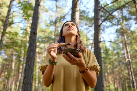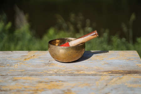 Tibetan bowl on the background of nature, metal bronze bowl musical instrument creating vibrations, yoga in nature meditation. high quality photo
