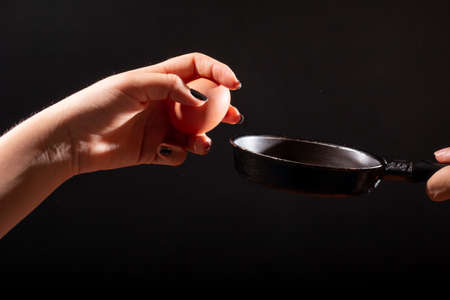 hand holding egg in front of frying pan. isolated on black background. Hand about to break an egg to throw it into frying pan.