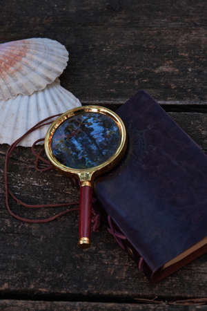 Magnifying glass on wood aged weathered background. Magnification concept.