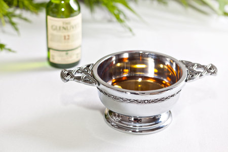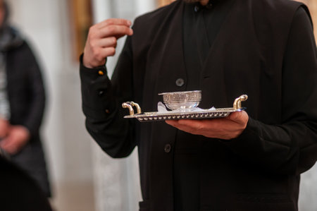 Ceremonial Elegance: Close-Up of a Silver Ritual Vessel Held by a Priest.