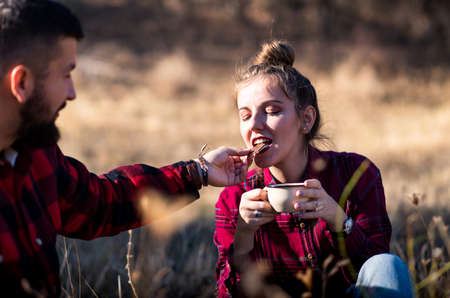 A girl in a blue kimono sits in the autumn forest and prepares tea