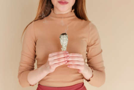Unrecognizable female burning sage smudge stick and smelling smoke against beige wall during meditation