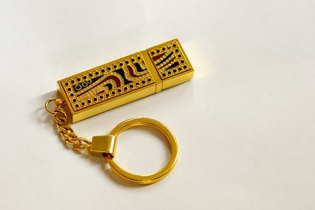 USB flash drive keychain made of golden metal with a pattern of shiny gems, imitating jewelry. Small electronic device containing flash memory.