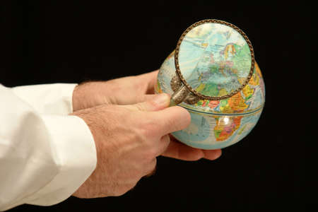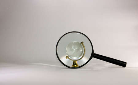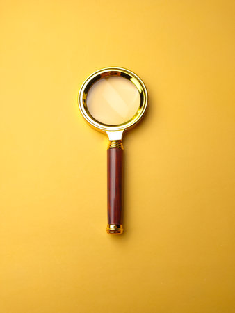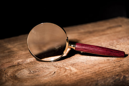 Close up Single Magnifying Glass with Black Handle, Leaning on the Wooden Table at the Office.