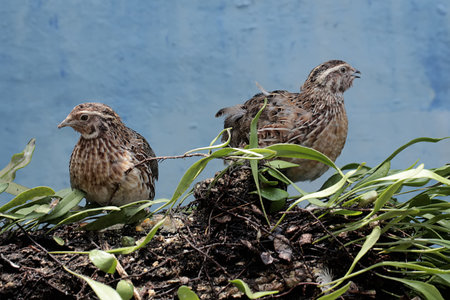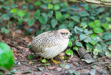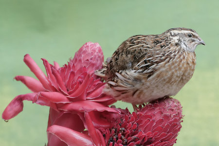 Closeup portrait of a beautiful quail in the garden with colorful background