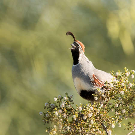 male Gambel's quail calling at Veteran's Oasis Park in Chandler, Arizona.