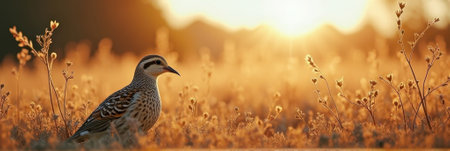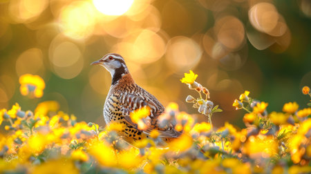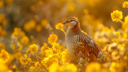 A Partridge Illuminated by Golden Light Among Yellow Blooms
