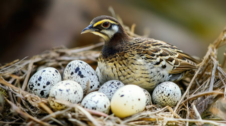 A captivating image of a mother bird sitting protectively on her speckled eggs in a natural nest, showcasing the beauty of wildlife and nurturing instincts.