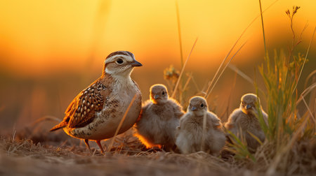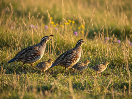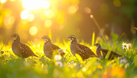 A family of California quails, known as a covey, stands together in a lush green meadow. Bathed in the warm, ethereal glow of golden hour sunlight, they create a serene and picturesque scene of wildlife in its natural, undisturbed habitat.