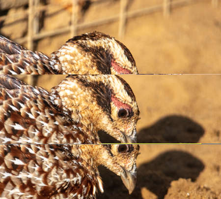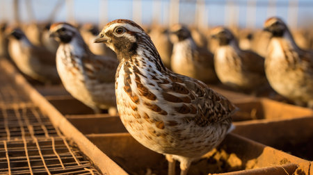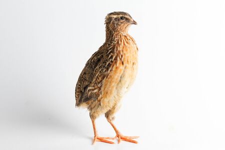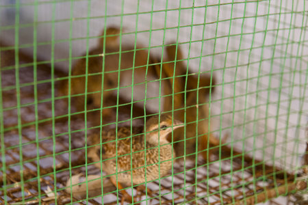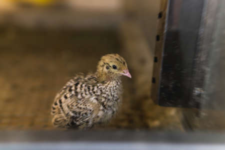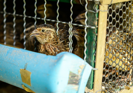 domestic japanese quail baby chicken kept in a cage in a hen house, close up