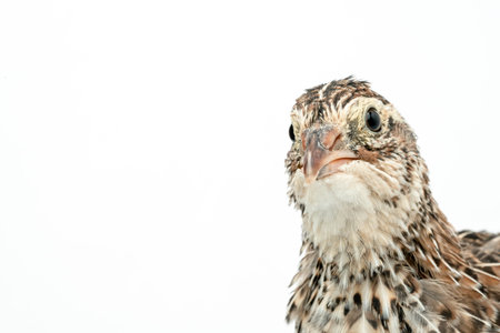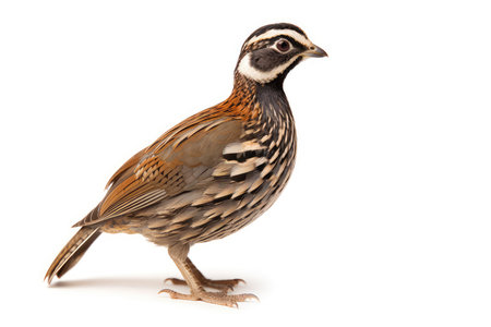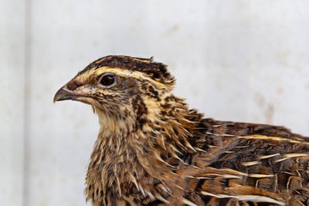 A quail stands calmly, displaying its detailed plumage and unique features. The bird is set against a plain backdrop, highlighting its intricate markings.