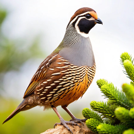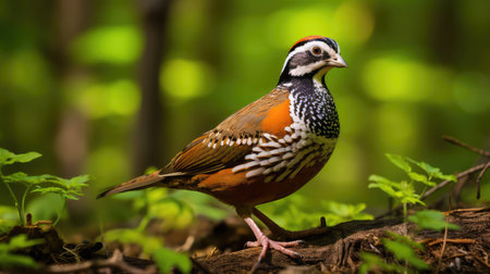 A stunning image of a vibrant quail bird perched on a wooden post, with a softly blurred background of green foliage and warm bokeh effects.
