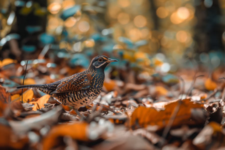 Autumnal Scenery with a Common Starling Among Colorful Fallen Leaves in a Tranquil Forest Setting AI Generative