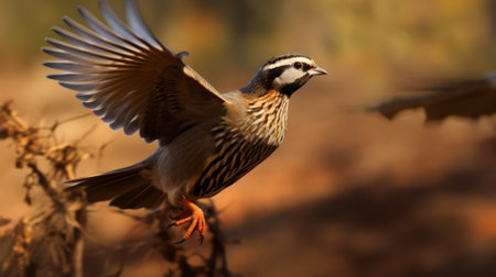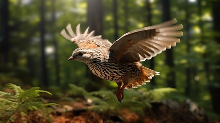 a small bird gracefully soars through a sunlit forest, showcasing a mesmerizing blend of mixed patterns. the intricate details captured with photorealistic accuracy highlight the bird's naturalistic poses. its feathers display a beautiful combination of light brown and brown hues, adorned with delicate dotted patterns. this captivating image showcases the artist's skillful use of photo-realistic techniques, creating a stunning visual experience. ai generated