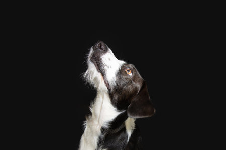 Attentive mixed-breed dog gazes away, Studio capture.