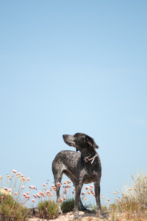 A vertical shot of a black pointer in a field under sunlight