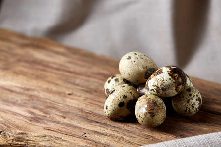 Group of three spotted quail eggs on a piece of wood over homespun tablecloth, top view, close-up, selective focus, backlight. Some copy space for your text. Delicious natural tasty appetizer. Dietary snack. Healthy lifestyle concept.