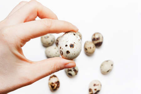 A female hand holds a quail egg in hands on a white background