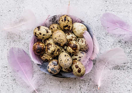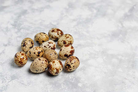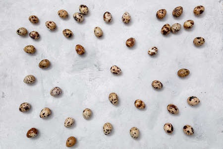 Quail eggs on a light concrete background. View from above. Free copy space.