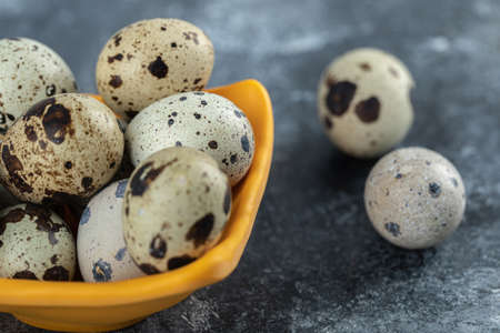Close up photo of organic quail eggs in yellow bowl over grey background