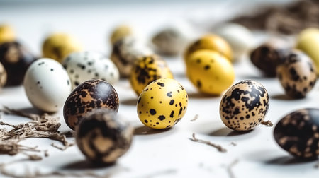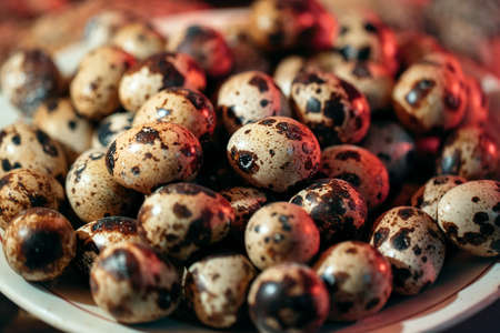 Pile of quail eggs close-up macro shot, selective focus
