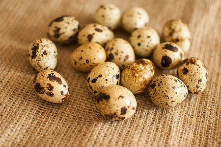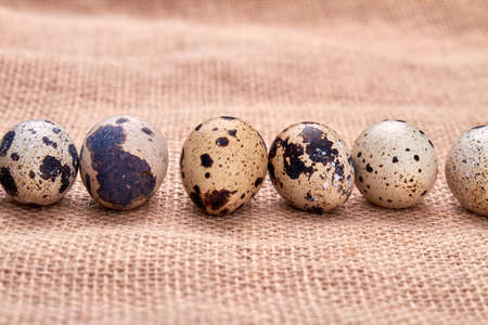 Close-up lying quail eggs on jute fabric cloth.