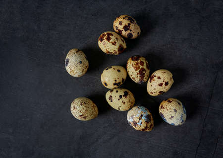 fresh quail eggs on a dark wooden rustic background.